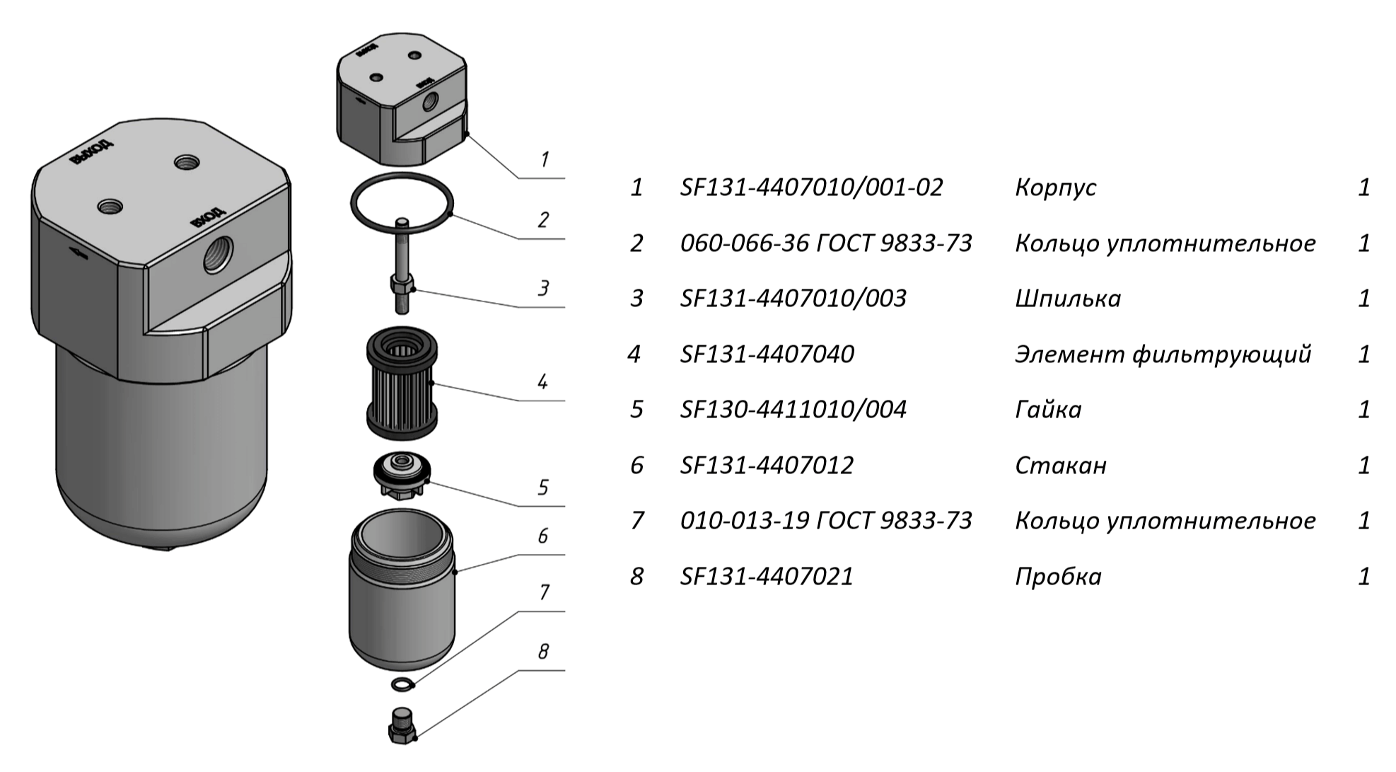 Корпус и стакан фильтра изготовлены из алюминия Д16Т, с анодированным покрытием черного цвета для повышения коррозионной стойкости.